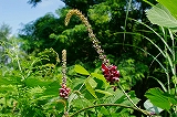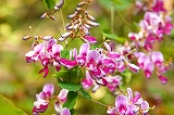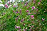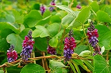 葛(くず) | 葛は、マメ科のつる性の多年草。濃い赤紫の花が、つるに沿って、下から順番に生えていくのが、特徴である。初期の風邪を治すのによく薬局で薦められる葛根湯(かっこんとう)は、この葛の根を干したもので漢方薬の仲間であり、くずきり、葛餅などの食用にもなる。一方、あちこちで根を生やすことから、農林業を営む人たちから、有害植物とされている一面もある。 葛の文字が、「葛飾区」の地名に使われている。 |