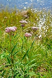 藤袴(ふじばかま) | キク科の植物。この花の名前を聞いて、源氏物語の第30帖を想い出す方も多いことと思う。藤色をした花の形状が、袴に見えることから、この名がついたと言われる。 中国から渡来したものだが、奈良・平安の時代には、帰化して雑草化している。乾燥すると、香りを帯び、漢方薬や入浴剤、匂い袋として活用される。 |