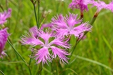 撫子(なでしこ) | 「撫でし子」に通じ、しばし子供や女性にたとえられる。 源氏物語第二十六帖の巻名「常夏」とは、この花のこと。光源氏と玉鬘が常夏の花(撫子)を詠んだ和歌「なでしこのとこなつかしき色を見ばもとの垣根を人や尋ねむ」に因む。 当時の貴族にとても気に入られていたことがうかがえる。 ナデシコ科ナデシコ属の品種は、北半球の温帯域を中心として300種ほど確認されているが、そのうち二種類ほどは、日本固有種である。 写真の河原(かわら)撫子は、別名大和(やまと)撫子とも呼ばれ、花言葉は可憐・貞節を表す。 同じナデシコ属の仲間に、カーネーションがある。 |