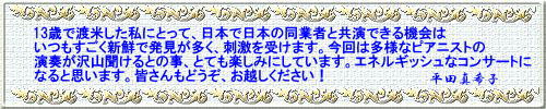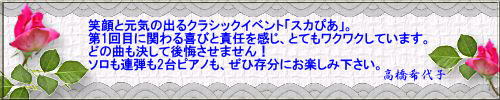 あります。この愛してやまない故郷で、同郷の先輩ピアニスト達と一緒に演奏が出来ること、そして横須賀の皆様、横須賀へ来て下さる皆様へ発信出来ることを、とても嬉しく思っています。様々な形態でのピアノ祭、お楽しみ頂けるよう、頑張ります。